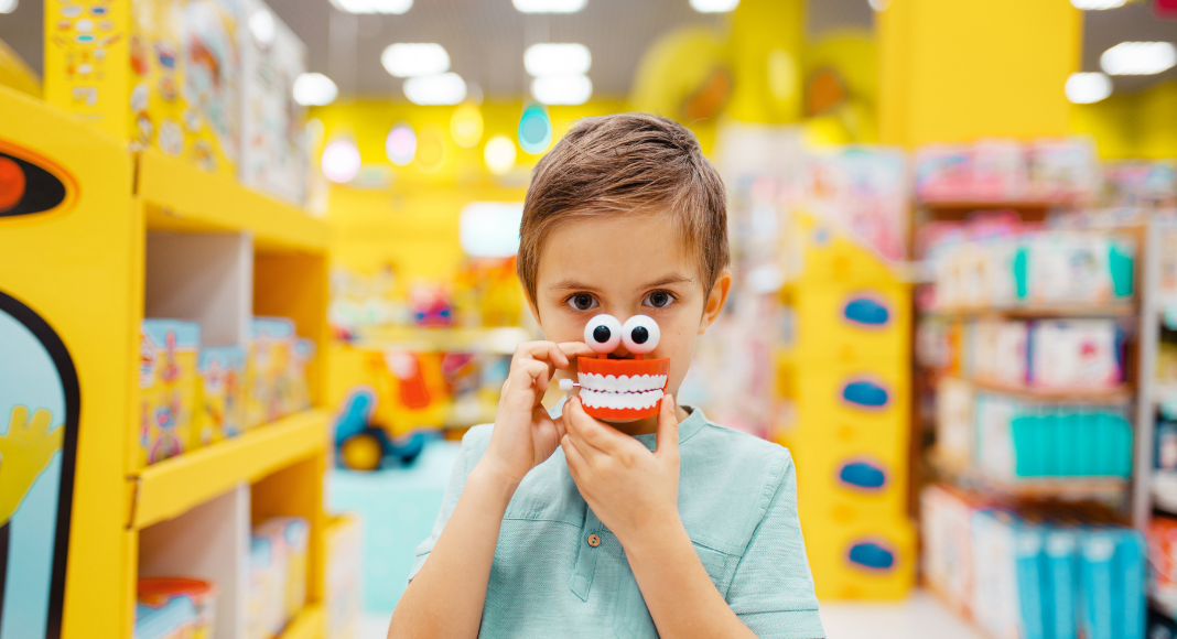 boy with fake teeth and eyes toy
